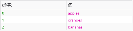 console.table(["apples", "oranges", "bananas"]);
