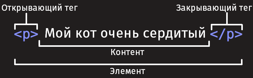 - Элемент: открывающий тег + закрывающий тег + содержимое = элемент.
